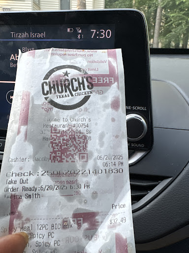It was 6:40pm when we got in the drive thru line. It was 7:20 pm when we recieved our receipt after being told there would be a 30 minute delay on our order. To me this is unacceptable. At 7:45 the š chicken was pull and put under the light. At 7: 50pm the chicken š was brought to us at my truck. The chicken was dark and hard. One biscuit was perfect as church's requires. My daughter got one of the frosted honey biscuits and she ate it so I presume it was to her liking. When we got home we gave the chicken š to my oldest grandson who eats everything. He is always hungry. I couldn't eat it because it was to hard for my delicate gums. They are always sensitive. The store is located in Austell, GA on Austell Rd. I love Church's fried chicken. And I will continue to give the benefit of the doubt until the service is completely unacceptable. I no longer patronize the Burger King across the street because of poor service. I will never go back. I will continue to report...