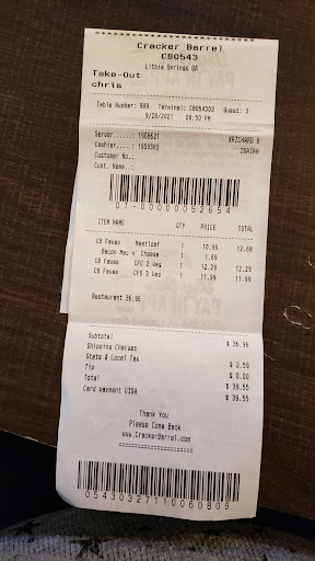 Read moreI've been going to Cracker Barrel for years. Usually the same location. The food is always good and the prices are very good as well. Their service staff is well trained, friendly and efficient. One complaint, and this maybe a corporate or a regional decision by some bean counter - I get their Momma's pancake breakfast, where you get 3 large pancakes. They give you one of their small bottles of syrup, which is just not enough for pancakes of that size. For the past year I am told that it is a big deal for the server to get another bottle when I request 2 instead of just the one. Sometimes they bring me more syrup in a little plastic cup, and sometimes the server figures out how to get me another small bottle. This takes up extra time and inconvenience for everyone. At least half the time the server, when they bring the food does not have the extra bottle with them and now has to remember to go back and get one, or fill that little cup with apologies that they can't get another bottle. It seems to me that either a regional manager, or some bean counter at corporate ran some numbers and said if we can reduce people using twice the amount of syrup at each location, times the number of locations, look how much more profit would fall to our bottom line. Customer service should always be the #1 priority. Always. The profits will always be there if you take care of your customer. One other small thing that is an irritant. The utensils come in a brown paper sleeve. Again, about a year ago, they eliminated putting a spoon in there for someone's coffee. They bring the spoon when you order coffee. Usually. When asked about that we were told two stories. One that the spoons are frequently stolen by customers, and second, that the people who clean the tables often lose them! Both seem implausible to me. Again, a small thing irritant that can...