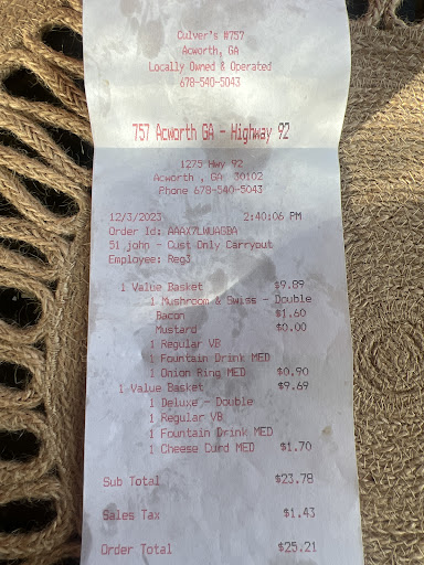 Read moreMe and my co-workers eat here daily. We loved the customer service and they are the best fast food restaurant you can eat at. Here lately our orders would be wrong. The first 2 times we dealt with it and didn't make to much fuss. We understand the short staffing and its always busy so we chalked it up. The third time we decided to call because they forgot a soup and we had to drive back to get it and we were even offered coupons for our time. That's 10 min there back to work then 10 min back again and then back. Then last Thursday we went and ordered thru the drive thru and they got our orders wrong. They came out and switched out numbers and then they came out with a totally different order. They messed up our sundaes and a value basket. It was suppose to be a regular chicken sandwich with onion rings. Onion rings are a upcharge remember that. We get back and it was a spicy chicken sandwich with no onion rings. We called up there and talked to Pam and she said we could come back and get what was wrong and we told her that was not going to work since we were super busy and that we could try to come Friday but most likely be Monday. She said that was fine and she would comp the chicken sandwich order with onion rings and both sundaes. We went in today Monday 12/13/21 and talked to the manager Skip and he told us he could not do that. Talked about how we don't have the white copy of the receipt. We never ever get a white copy just a pink copy which apparently is not right we have to get the white copy. First he had to call Pam since she was off and wasn't there. She didn't let anyone know we would be coming today. They fixed our sundaes but only gave us a chicken sandwich. Not even a value basket just the sandwich. One of the reasons I am leaving this review because if this was a different location they would of helped us and not cheated us. Skip acted and even said they had a lot of thieves and trying to get free food. That left a bad taste in our mouth. We would never try to get anything for free. We know how retail works and would never do that. Like I said we usually always eat here everyday for lunch but I think we need to take a break until Culvers in Acworth can figure out how to fix this "thief" problem since apparently its happening and it's not the employees not caring and just messing up.