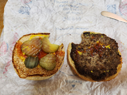 When you pay almost 27 dollars for a fast food place and you get a kids meal it is very upsetting and honestly offensive. For the average Joe to eat here at a 12 dollar an hour job you would have to work three hours just to eat lunch with a loved one. I am truly sad at this. I bought the flame thrower burger it was good flavor wise but the burger was not even luke warm. I then looked at my husband's fries and he received a Mc Donalds size small. It was supposed to be a medium. With the price gouges and the economy right now it will probably be a never ever...