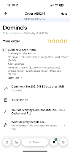 Ā Ā Ā Read moreIf you like employees tipping themselves you'll love ordering from this location. I typically don't tip anymore at this dominos because the last time I left a generous tip the delivery driver left my pizza on the ground in front of my steps. Instead of it being on the front porch so of course every creature and bug was all over my food. I ordered from this place yesterday on 12/18/2021 and my total was $16.93. Before you place your order the "no tip" button is already selected for you and I saw my order total in plain site. It's even in the email and my paper receipt didn't even reflect a tip. I checked my bank statement today and somehow there is a $7 charge added on to my order out of thin air. I called today and I didn't get no good explanation on how this happened. $7 isn't much to trip on but it's the principal of the matter. The manager tried to convince me that its added on later but when i tested it out just a few minutes ago the entire order total shows the tip included. You actually have to press a button for that. Neither the manager or employee could tell me what went wrong. Granted I was given a full refund I just don't like the fact that my money was being played with. I will not be ordering from this...