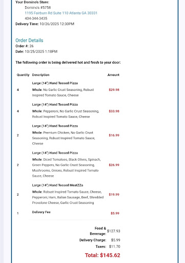 Read moreI just moved to this particular side of town a few months ago. I have become a regular with my long hours, a lot of times late hours. Pizza, wings or pasta is very convenient. I wanted to stay bias excluding the ratings and reviews. In a business things happen (longer delivery times, product not available etc) but customer service... Lets just say you can NOT train a person to have a personality and manners. There is a manager in particular LAUREN, she didn't give a last name when I asked, she only kept repeating it's Lauren. Terrible Terrible Terrible customer care resolution. The staff I think is too young and inexperience to run a store for even a shift. When I called in an order from work, the guy that took my order didn't verify my phone number. So when it was time to deliver and he couldn't find the correct address i gave him (which the manager Lauren Lauren said he came and no one answered) They took my food back to the store and refuse to send it back out due to their staff not following proper phone etiquette and recording accurate customer information. I was ordering lunch for my kids so this was very important for it to get delivered. My job is more than 20 mins away. She (Lauren Lauren) said she is making an "executive" decision by refusing to send out because she is short staffed. She offered a refund which i know wouldn't return right away or to come pick up cold pizza at the store. Finally after 10 mins of arguing(smh) she agreed to send it back out , but for me to later find out the pizza was below DOMINOES STANDARDS and the pizza was really cold. I suggest MANDATORY STAFF RETRAINING or just close the store completely if you're going to keep people employed that don't care and a product that is not worth supporting.