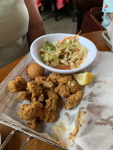 Very loud in the restaurant and very crammed. Eventually got a table the servers seat you wherever there is a space. While the views overlooking the March are nice, I would not have waited over an hour to be seated outside at dusk on a bar ledge looking out to the marsh. Feeling crammed in like sardines and fighting off the mosquitoes seemed to be a common theme at Fiddlers. Well I guess this was the unkown trade off with actually being able to find a parking spot outside. With not much room to sit and relax to eat ended up just ordering the fish and chips. My other half had the same with an order of fried green tomatoes 🍅. Fish was good, fries were alright. Hush puppies were just hush puppies. Fried green tomatoes did not get a very good score above just being average.