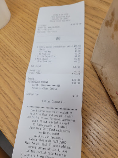 Read moreOn November 10th, 2023, I realized how long it had been since I enjoyed a Five Guys burger. I went to their 1611 Satellite Blvd, Duluth, GA location and ordered 2 bacon cheeseburger combos all the way for my wife and me. It had been one of those days, tough, stressful, didn't wanna do any prep and cooking, just wanted to get home and tear up my burger and fries and hit the hay. Got home, dug in...no bacon on my burger. No bacon my wife's burger. I checked the receipt, and it was there on paper, but non-existent on the burger. I was pissed. I did not feel like getting back out, so I fumed for a moment, my wife said, "Calm down, eat your burger," but I called and insisted I didn't want anything for free, just to let them know of their mistake. I wasn't rude or anything, but the manager there, David is his name, he said, "Your next two combos are on the house." I told him we rarely go out, and it'd probably be a while before we came back. He said, "I gotchu." I told David that if he honored his word days, or even weeks later, I would write him a great review. So that's what this is. I went back a month later, he was there, and he HONORED HIS WORD. The burgers were perfect, David, thank you to you and your crew. We will make it a point to patronize your Five Guys in the very near future. David exhibited leadership, humility, great...