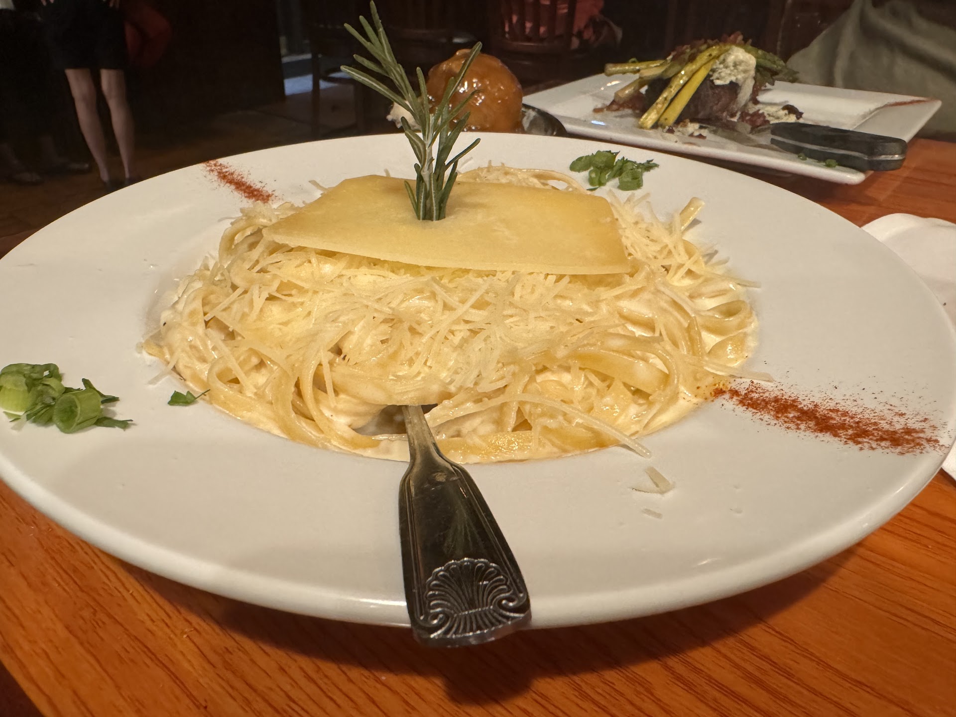 Our server, Amanda O was the best! She was so patient with me as I have issues with certain foods and was amazing at telling us anything about the dishes we had questions about. She went over the specials, which sounded amazing to my husband so he went with that. I really wanted to try the lasagna but unfortunately they were out of it that evening. I decided to try the fettuccine Alfredo. We ordered the mini beef wellingtons for appetizers and they were delicious. The pastry very soft and beautiful crunch. They were done quickly. We also enjoyed the breadsticks, though my husband informed me these ones didnāt taste as āfreshā as the ones heās had on previous visits. I still enjoyed them.