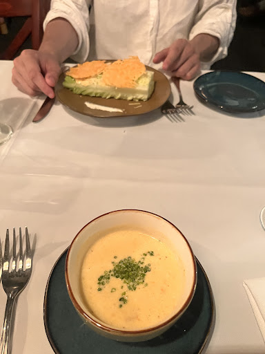 Finally, the food; chef’s kiss. I started with the Creamy crab soup w/ chives while my partner had the fork and knife caesar salad. Both our appetizers came out quickly. The soup was absolutely delicious; it was creamy, slightly spicy, rich in flavor, and it was the perfect amount of soup for me. My partner’s salad was a stalk of romaine lettuce topped w/ Parmesan cheese and lightly coated w/ sauce along with a side of very flat, heavily crisped cheddar (which was odd and he didn’t like very much). As he says, his salad was still tasty. For the Entrée, I ordered the herb crusted rack of lambs while my partner ordered the seared scallops w/ sweetcorn risotto; both dishes chef’s kiss! I ordered my lamb medium rare and it came out perfectly cooked and succulent. The flavor was astonishingly perfect and with every bite I took I could just feel the love put into the dish. It also came with baby onions, cauliflower and baked scalloped potatoes. Everything on that dish was to my liking besides the cauliflower which had a roasted flavor I was super into. The seared scallops were delicately cooked and nicely soft. The risotto was tasty as well. Everything on my partner's dish was perfect except for the collard greens which had a resilient smell of vinegar and a very bitter taste.