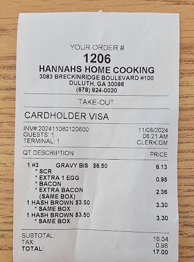 ย ย ย Read moreLocated in a shopping center off of Breckinridge Blvd and Old Norcross Rd Hannah's Kitchen is a gem. It's homestyle food and atmosphere is both relaxing and inviting. It's a family owned and operated business and they never disappoint. Breakfast: They offer simple staples such as, biscuits and gravy, croissant breakfast sandwiches, pancakes, french toast and biscuit breakfast sandwiches (and more). The food is made to order and they are quick and efficient. Lunch: Everyday they have different meats and sides. These items are homestyle southern foods like fried chicken, country fried steak, mashed potatoes, cole slaw, etc. They give youan entree and two sides with a drink as their lunch special and it's worth it! They give you huge portions and the food is great. With a price like theirs and exceptional customer service it's hard to beat! I recommend giving Hannah's...