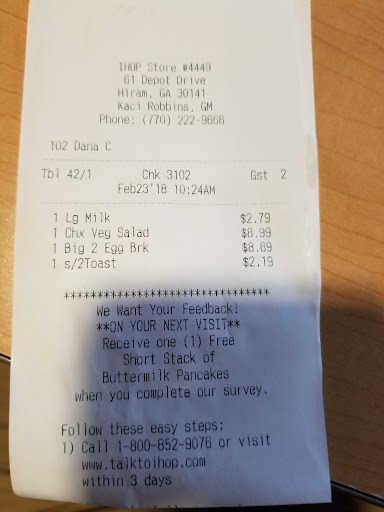 Read moreSo I pulled up There where no cars in the parking lot. So I thought they were closed but the The waiter and the cook and I. Guess the dishwasher lol was outside smoking cigarettes so I went in to get some pancakes. Some French fries, some cheese sticks. Which I eat them all together With syrup. I'm a bit weird like that. Sometimes Well, food came. A hair on my pancakes. noticedI put butter on them before I noticed the hair. The butter was hard, so when I was pressing it down. My pancakes ripped in certain spots that I (noticed on every layer So I called a waiter, tell her that there's hair in my pancakes She gets a discuss face and takes the plate. She brings back my pancakes. I'm thinking it was a fresh batch. Well, I go to put my butter on just like I did on the first pancakes that I received. I notice the indentations and rips from the butter that I put on my first pancakes. And they were shiny like they were already buttered now I'm noticing. These were the pancakes that I sent back. I'm thinking you lazy people🤬. With people🤬 in all caps, you know Almost got out of character. But I didn't need my county Police chasing me down, I got the waiter. Total to take the pancakes off the check Cause I'm not paying for this. I was pissed It didn't seem like anybody That was working that day was the manager, so I. Kindly grabbed my stuff and rolled By the way, I do not recommend their pancakes. Pancake batters not fresh, it's refrigerated. So it falls apart. Splits in half and crumbles...