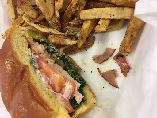 The chicken club presented a moist and perfectly golden boneless breast. Juicy tomato. Crisp lettuce. And, perfectly buttered white bread⦠This sandwich was bite after bite of robust flavor and texture perfection. Paired with the slice of pickle, the chicken club is a true 10/10.