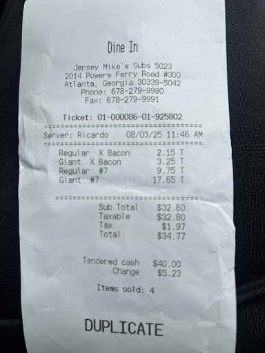 Read moreGoing to the Jersey Mike's location on Sandy Plains Road for a couple of years - I have loved everything I have ever ordered there. The people are friendly. The portions plentiful. But, I moved closer into town and live a half mile from the Powers Ferry location. I jokingly told my wife upon leaving to visit the closer location, should I just drive the 3x distance and go to the other location. We laughed it off. I didn't obviously. When I ordered the giant club supreme on white.. it seemed like I had to re-order every part of my order. A GIANT? Yes, a giant. White or wheat? Umm - white. You want CLUB SUB? No, CLUB SUPREME. How about listening to the customer? I am the ONLY ONE IN THE STORE! Anyway, the real BEEF I have with this visit is the fact that there is NO WAY they could have put any less meat on this sandwich. I was shocked. It was worse than Subway. 4 slices of turkey. 4 slices of roast beef. It was ridiculous. I was shocked. This sandwich was 12 dollars. It didn't even TASTE like the same sandwich I always got from the other location. From now on, I will either drive the additional distance to go to the far superior location, OR go to either Jimmy...