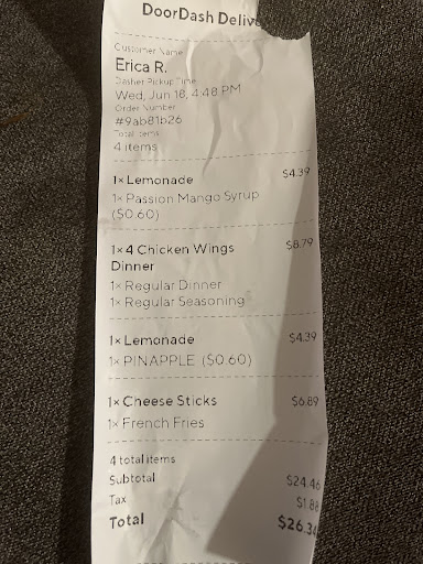 Read moreFirst order via uber eats delivery. I wanted to try food from here since it opened. I am SO DISAPPOINTED in the low quality food my family and I received. I ordered 3 4-count chicken wings with 2 sides. What was advertised versus what arrived differs very much in both look and taste. The advertised wings looked plump and fresh, golden brown. The delivered chicken wings were small, wrinkly skin and had a taste, scent and look of reheated chicken sitting under a lamp or refried. The chickens' temperature was lukewarm but the fries were hotter in temperature but were crispy, crunchy and clumpy. A few bread slices had hardened crust. I like the dash of house seasoning upon the top portion of fries and the wings, but I think it masked the odd scent of some of the wings. The first chicken wing I bit influenced me to sniff and look at it, but the seasoning hindered my efforts. The texture of the meat looked slightly dry. I know this chicken was old and yet I was charged as if the wings were fresh. I suspect the fries were idle under a heat lamp, too. The three 2 ounce cups of cole slaw was a major insult. I am dubious to order anything from here because what is shown on uber eats will differ to what will arrive. The only kind gesture from this business is the three stapled packages with the napkins, hot sauce cups, ketchup packets and plastic forks, and the stapled bag holding the entire order. Truly, I'm skeptical of what to expect from here based on this...
