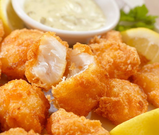Preheat oven to 450°F. Line a baking sheet with aluminum foil. Cut fish into bite size pieces (2×1-inch). Pat fish dry with paper towel. Combine bread crumbs and creole seasoning in a small bowl. In another small bowl melt butter, add olive oil and a dash of salt. Put flour on a small plate or bowl. Start dipping fish pieces. First into flour, then into butter mix, and finally in breading (make sure they are completely coated). Set onto a baking sheet and repeat until all fish pieces are breaded. Spray bites with cooking spray, this will help brown the outer edge. Bake for 12-15 minutes or until the fish...