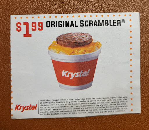 Read moreThis was the absolute worst experience I've ever had at Krystal burgers. First, you could barely hear the person taking orders at the drive through. Secondly, when we arrived to the window, the male staff member got an attitude about us not hearing him. When I kindly explained that we couldn't hear him at all, we received more attitude instead of an apology. I understand it if you are doing the best you can with faulty equipment, but the attitude is uncalled for. Third, we were told to pull forward to wait for our order. It was 24 cheese Krystals, 3 large fries, and 3 corn pups. After waiting 30 minutes, I went back to the window to ask what the hold up was. Again, I was met with nothing but attitude. When I went back to the car and told my boyfriend, he went to ask for a refund. At this point over 40 minutes had passed and wr still didn't have our order. He was rudely told that they don't give refunds. And somehow our order was magically ready after 45 minutes of waiting. The rude staff said they gave us 2 extra Krystals for our troubles, but they didn't. (Not that food makes up for a 45 plus minute wait and the rude staff.) After visiting Krystal burgers for over 30 years, I think this is one family tradition that will be dumped. (We have always made it a habit to have at least 1 Krystal burger every trip down to GA., and we visit several...