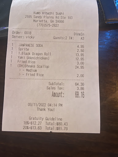 Read morewent to dinner with family which included a 4 year old. we arrived before 7 pm, ordered our food, and only received one persons salad and our drinks. by 745 pm, we finally asked if we could have the other salad we ordered, and we asked them to bring our sons food. the waiter never checked on us or refilled our drinks once. we sat until approx 815 pm before finally realizing we prob were not going to ever get our food, as we had watched several to go orders come and go, and everyone else in the place that arrived after us had already received their food, and checks at this point. When we asked for our check, and asked why we had been waiting over an hour for anything, they looked very confused (we assume they mixed our order up or lost it somehow, because they were constantly messing other orders up while we were there) the female said it was because hibachi cooked faster, and the sushi chef was working on our order still. the one service was appalling. the chef was working on to go orders only, as we sat and had watched him for awhile wondering if it was our order he was making, only to watch it get bagged up and handed to someone who came in after us and ordered. this was our second time trying this place, and it will be the LAST. both times we had the same horrible experience, and i don't care how good the food is, esp with a toddler, there is NO EXCUSE for lying to customers, or taking nearly 2 hours with food, let alone even coming up to the table to offer refills or update us on...