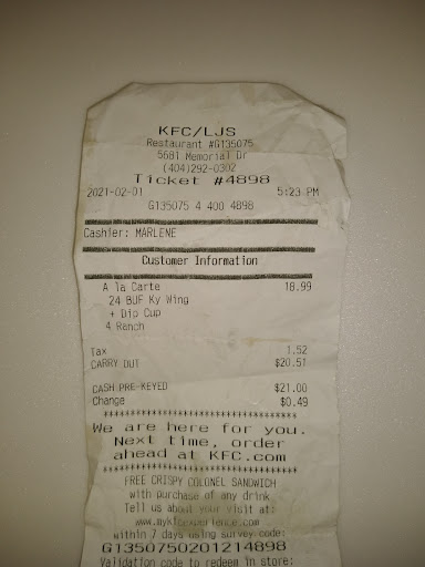 Read moreThis review is based on my family and my last drive thru order at which a KFC order was made for a family meal. This was over two years ago and the reason we have not eaten KFC since then plus the KFC locations have dwindled near our residence. The cole slaw was divided unevenly into two black plastic containers, and the difference in their amounts was noticeable. The lack of dressing the cole slaw had in both containers was noticeable, too. We informed the female employee at the window that there was a difference in the amounts of cole slaw. Then the black male manager said to hand it back after much disagreement and negative attitude despite we didn't leave the window, so there was no room for doubt of the claim. My family was calm the entire time, so his unpleasant attitude was not invited. The cole slaw that was least was trashed and another was given in its place. That manager's nasty demeanor ruined the atmosphere and our desire to eat with enjoyment. My mom was craving KFC for a while, so that day was to be enjoyable. It wasn't like we're trying to deceive or cheat this poorly ran establishment. When we asked for the to speak to the manager, he ssid boldly that he was it. The order was already paid before the food was handed out the window. I had video recorded part of the encounter but I knew not where to send it to address that manager's evil behavior. I now call it kang behavior. What did he gain? Nothing! The other items of the order...