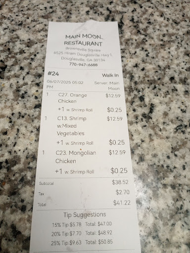It is disheartening to witness a establishment that, despite its purported commitment to equality and opportunity, falls short in the most fundamental aspects of customer service. A visit to Main Moon in Douglasville GA, located next to Food Depot, revealed a stark contrast between its professed ideals and its actual practices. The limited menu, coupled with the indifference of the staff, created an experience that was both disappointing and perplexing. It is a sobering reminder that true progress extends beyond mere rhetoric and requires a genuine dedication to human connection and respect. It's amazing that something as simple and original as Egg Foo Yung with Strimp and add Broccoli, was a difficult challenge and a dish that they were unable or just...