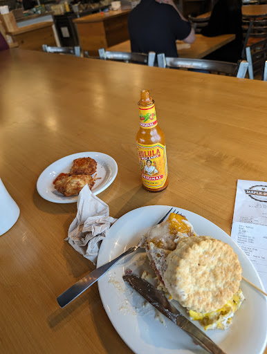 Read moreSo at work on Sunday our boss decided to treat us to a breakfast late treat. Each of us chose off the online menu and she turned in the order and went and picked it up for us. That being said, there was about 11 orders. I can tell you that the reviews of the 11 people were all that the food was favorable. Tasty but this menu line just doesn't fare well for a tear ago order. The waffles by the time we got them were extremely soggy. And gravy were soggy, items are cold and it just microwaving didn't seem to enhance the product. So I think a much better review would come if I had eaten at the restaurant. Now what I had was what's called the farmer's biscuit which is a biscuit with a deep fried chicken breast apple with bacon, cheese and maple syrup. Well being cold the cheese. Although it isn't a real cheddar cheese, not some fake cheese like fast food places use was congealed oddly and even warming it up. Didn't really help. The chicken was very tasty. The chicken was moist. The app would bacon was good. The biscuit had great flavor but again was totally soggy because all the maple syrup. The one shining star was the grits! Being as they had butter and cream cheese they were smooth silky very tasty to my mine I added a bit of salt which brought out the flavor more to me but that's personal taste. But these grits were great. They were the star of the food. I don't know. Maybe if on the to-go orders they would put the syrup in a container or the biscus and gravy separate from one another or the biscuit sandwiches that had gravy on them if the gravy could come in the side item. Anyway, pictures will show you that the product does look good and again the chicken was wonderful. Flavored it was moist. It was tasty. It was a good sandwich. It just would have been better if I'd eaten at...