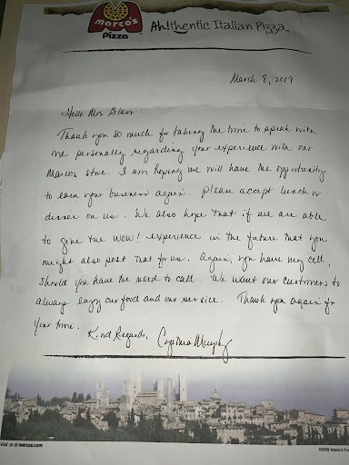I order frequently from your chapel Hill and morning Star locations. I have a personal and corporate account when i buy lunch for my employees. Lately it has always been something at your Chapel Hill location, a couple months ago i ordered soda with my pizza and the delivery got forgot it⦠said he would bring it back and never did. A couple weeks later i ordered pizza and wings and my pizza had shifted to the side as if it was smashed or dropped and my wings were cold. As i tracked my order via the app my delivery time kept changing the driver apologized and told me they added deliveries as he was leaving. This last time i ordered Iām pretty sure i had someone else order and they had mines. I called in and they confirmed i had someone else order. I asked if i can get the correct order sent and they told me it would be a while before they could get it out. I asked for a manager and they put me on holdā¦ā¦came back and said they manager wasnāt available but they can assist. I told them if they couldnāt get my correct pizza that i paid for out to feed my family i wanted a refund. The gentleman put me on holdā¦. Came back again and apologized and told me i would have to speak to the manager⦠and before i order online call in and ask for the manager. Today 10-5 i called and asked for a manager and after i was drilled on why i wanted to speak to a manager a young lady finally came on the phone very dryā How can I help you ā. I explained my dilemma and she told me she didnāt see any notes so there was nothing she could do. I told her i KNEW this was going to happen and i was upset because my last 3 experiences there was a problem. She put me on hole and came back and said she see no notes so she couldnāt do anything. When i asked for the corporate number she told me unfortunately⦠they wer franchised and i was speaking to her⦠Makaylaā¦( so i assume she is the owner). I have always eaten Marcos for about 15 years and never experienced service as bad as my last three visits to your chapel hill location. And Makayla as an owner, you need to understand when there is a mess up⦠you try to make it right. My money was spent⦠and in my eyes wasted. I wouldnāt have left a review because i know things happen⦠but i didnāt like the way you handled it. I also work in customer service so I understand there may instances where the customer is not rightā¦.. but i feel as a owner Malayaā¦. Instead of being rude⦠and brushing me offā¦. You should have tried to...