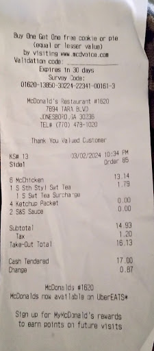 I remained standing at the counter with no further interaction from anyone for almost 10 minutes. Additional guests entered to place orders and where met with the same gruff greeting I had received...NONE...Except to place orders on the kiosk.