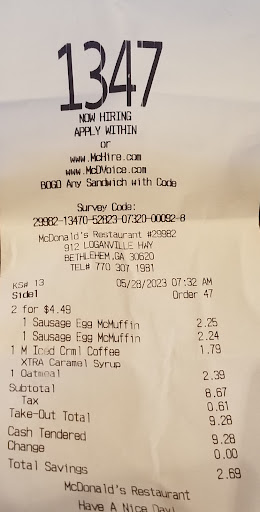 Read moreReally needs more training for the workers on the registers in the drive thru. My order was 2 mix and match. 1 sausage McMuffin, 1 hash brown for each, a medium coffee, and a small dr. My Wife paid with a card, and as you can see with the first receipt that was given to me it was not what we ordered, probably just the wrong receipt. When I brought it to the attention, the young lady took my Wife's card and ran it again for another 2 for$4.49. If you don't specify, they ring it up the highest possible way. When we get the original bag, it was only missing the sausage McMuffin, and then they gave us another bag with it and another hash brown. So we had 3 hash browns. I brought it to the manager attention and that's when she provided the second receipt. My Wife checked her banked and she was charged $10.54, and $2.56 for a total of $13.10. The order should have been rung up as 2 2 for $2.39 with a sausage McMuffin, and hash brown. Normally I get one of those with a small dr. pepper at my normal McDonald's, and the total is $3.79, and they want me to think that ordering a second one with a medium coffee will bring it to $13.10. I'll be requesting a refund for the difference, and won't visit this location again. I also experienced at other locations other than my normal one, they would ring up a large combo by default, rather than medium, but same thing I just...