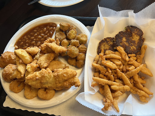 This was a last minute stop while passing through Brunswick and I recalled this place in the past, but now seafood has been added and this place is new. There are 2 registers and upon walking in there are booths and tables, as well as a take out counter. Of course me and my guests were new there and had no clue if we should have a seat, wait to be seated, or what, but we did walk to the counter and there was 1 person who was assisting 1 customer then afyer she turned around and started grabbing things from the food window..meanwhile we were just standing there with uncertainity on how to be assisted. There was a guy who came out then immediately asked is for our order..a party of 4, so we ordered but he failed to put an item on the menu and assumed we would know about the product which was presumptuous of him, but finally ordered and waited for the food, we did tell them it was our first time there, but no further assistance was provided, yet self explainitory from there. Now to the food..đ. The food came up HOT and READY! Grilled fish and shrimp meal. Omg..the tilapia was so moist and well flavored that it just melted in my mouth. The hush puppies were light and fluffy, yet, crispy. The okra was ok but a lot of ends that I could not bite through..I ended up spitting out half the okra for that reason. The fried shrimp were medium size and delicious! They have baked beans on the meni which was pretty good, the tea was not good..watered down and tastes a bit old. They offered a new shrimp dip as a sampler before we left and I'm looking forward to that when passing through again. Overall the food made up where the customer service lacked, so a 4 out of 5 overall. Still left a tip although there was no server. The crab cakes taste good , but would like to have tasted more crab than...