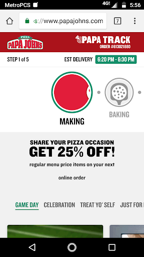 Read moreSo I placed an online order last night at 8:54 after driving all the way from Orlando to Atlanta. I got an email confirmation with an estimated time of 75-85 minutes. I'm thinking that's okay cause it's Friday in Atlanta. 2 hours go by and still no pizza. I go to check the status and it shows it's made but not baked. So I'm thinking there's a delay in updating the site. I call the store and they tell me its 4 to 5 hour wait on delivery orders. OMG! I said well then you need to refund my money and the girl argues with me that she cant do that to which I replied yes you can cause I agreed to the estimated time not 4 to 5 hours. Then she says well your pizza is ready now if you want to come pick it up. I said not after driving all the way from Orlando I'm not and I want my refund. She said Have a nice day and hung up on me!!! Then I went on Twitter and posted about it. Then they text me stating my pizza is on the way. I text back and said no void the order and refund my money. They called me 2 more times just to say the were voiding the order. Papa John's asks me to PM them on Twitter so I did and they said they would have the store owner get back to me to resolve the matter. He emails me and says they are sorry and my money will be refunded. He then types "we are working to replace the workforce in that LOACTION"...he couldn't spellcheck apparently because it's spelled location. Nevertheless I am not ever ordering from that location ever again. There are other Papa John's locations that make good quality pizzas and meet my...