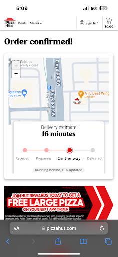 Awful experience. I have had two very bad run in's with this location, and normally I would not leave a review, but my most recent experience calls for one. Two months ago after just moving to the area, I placed an order on a Friday night with Pizza Hut for delivery and paid with card. Two hours go by and no delivery was made to my home. I then proceed to call the location and the manager on shift answers the phone. When I ask about my order she tells me she cannot find it, and proceeds to ask questions like "are you sure you placed it for today?". I respond to all of her questions as I was looking at the emailed receipt of my order while talking to her on the phone. She then proceeds to hang up the phone in the midst of me talking, and I immediately drive to the location to confront the manager and demand answers. All in all, they tell me that apparently the delivery driver decided to never come by my house and I end up receiving a refund, as well as no explanation for the poor customer service on the phone when talking to the manager. I let things slide since I received a refund, and carry on. Flash forward to the date of me writing this review. It is another Friday night, and being in a good mood I decide to place another order with Pizza Hut for delivery, this time with cash. It is about 10:30 pm the order is placed, and the location closes at 12 midnight. After about 11:45 with no delivery I call the location and no one answers so I decide to drive to the location to see about my order, and try to save them a delivery trip. When I arrive I am told by the same manager that they have thrown out my order?!?!?! I am honestly not surprised, as my first experience taught me that I should not have given this location a second opportunity, and should have taken my business elsewhere. If I could give this place "0" stars I would. I do not recommend this location, their customer service is terrible, and the people who work there have no care for making sure their customers are getting what they pay for. It's Pizza Hut, so I do not expect too much from them anyway, but people come on.... do better. We were once a Pizza Hut household......