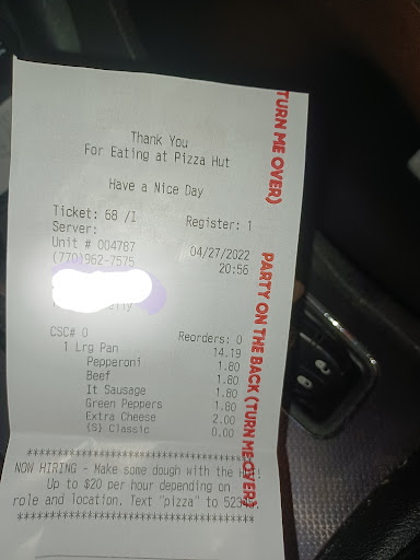Read moreI placed an online order, as I always do to earn my points and free food. This time around I did the curbside pickup, contactless. My order was for 7:45 pm which is my lunch time. I left a little early for lunch to get my food on time and still have a full 30 minutes to eat. When I arrived, I texted the number with “HUT” and was asked for my name and car. I never heard back after giving my info. I watched the manager and one worker with locs look at me through the window as the only car outside and not move an inch.. I’m thinking, “ okay, maybe I can give 5 mins for it to finish”....