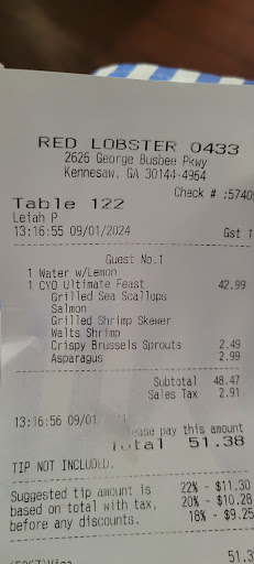 Ā Ā Ā Read moreexceeded my expectations by far! I'm 50 years old and I had never been to Red lobster, for the last few years i had The thought a few times of, gee, I really wonder what Red lobster is like. sometimes people joke about it and what not but I had a phenomenal experience. The service was very attentive but not overwhelming. The food and presentation was awesome. I really should have taken a picture, it looked like what you see in a commercial. I got the surf and turf without the filet upgrade. but either way it's a great value and price and the food really was delicious. My wife is super picky about her lobster and we've been to nice lobster restaurants where she didn't like it, but she loved this one when I gave her some bites. Even my super picky young daughter didn't hate it (she was always too scared to try lobster before) and that's saying a lot. The fries were crispy, hot, and well seasoned, and we are pretty critical about subpar fries. and my broccoli was very flavorful. My son got the mahi, He's unbelievably picky about his food and he really liked it. My daughter liked her chicken tenders and ate them all, and my wife, who, as I said is really picky liked her shrimp scampi a lot. We all tried her shrimp and everybody liked it, and there was so much. I have a whole lunch portion worth of leftovers from her that I'm going to eat today. the portions were very large. honestly. . my meal could have fed two people but I have a huge appetite. We often try to find places that's a good fit for my family to meet up with my parents without anyone having to spend a fortune and this was clearly a winner for us that I told them about and we all agreed we'd be coming back to...