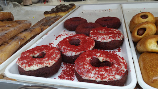 I bought one glazed plain and one unglazed red velvet. Dough in both of these donuts did taste less sweet than the three shops mentioned above. The sticky glazed coating is extremely sweet though, so avoid anything glazed if you want less sugary taste. The unglazed red velvet was delicious.