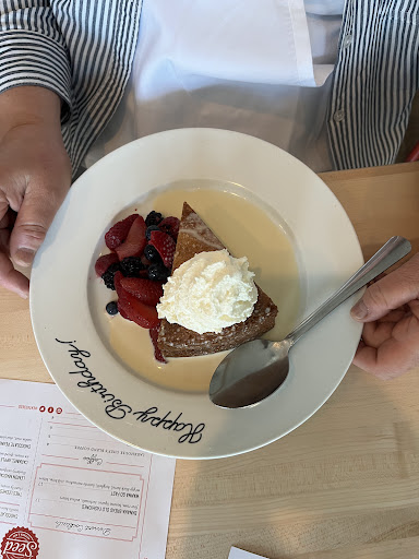 When out server delivered our drinks, she proceeded to spill an entire glass of wine on my husband, glass shattering all about. She was very apologetic and I'm sure felt terrible about it. The manager came in and at first offered to bring a manager's shirt for my husband (his was soaked with wine). He then said he didn't have any, and I suggested one of us getting something from Kohl's across the street. He said nothing and no one offered to do anything else (pants were soaked and stained as well), except to pay for dry cleaning. They cleaned up a bit, but we had to ask them to wipe the table and chairs, which had gotten sticky. We also had to later request silverware and napkins, as ours were used to clean up. Certainly, we shouldn't have had to ask!