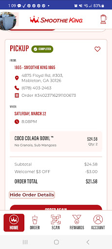 Went through app and ordered 2 coca colada bowls ... usually we go in and order, came to pick up and young lady went to the freezer to get them (I arrived as app suggested 18 - 23 min after ordering.) I took them to the car and home immediately... then we opened them and they were like soup. This is at 8:30 ish time frame of night...so we were not going straight back at that time of night. Anyway, next am went in to shop and asked what they could do? I spent approximately $25 for a VERY POOR PRODUCT (and had proof of purchase in app including time) I thought they would do something for us. The young lady at front was very nice, she called the manager and was told they could not do anything for us... (because I didn't bring the containers back in) give them a coupon. I already had coupons through the app. All I can say is if you are charging $12.29 per small bowl... they better be a top notch product! Smoothie King apparently doesn't value good returning customers! Sorry Service...