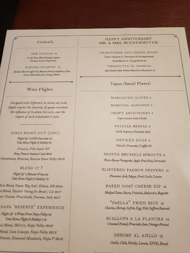 Note that Since this is a wine bar they serve tapas style items. There is only one entree available and it is a burger. We ordered Brussels sprouts, deviled eggs, shrimp, goat cheese dip and paella. The Brussels came out within minutes of placing our order. They offered a new take on Brussels. They were drenched in an oil based sauce, mixed with apples, and bacon. They were decent. Nothing that I would recommend, but also if I had to eat them again I would. Next the deviled eggs arrived( serving of 1.5 eggs). They were beyond disappointing. There was a hint of a truffle taste. I have had the deviled eggs from Seed and they are 10 times better than the ones offered at the wine bar. The shrimp came out next. They are served with bread. The shrimp are served sitting in a butter sauce. This dish was also just ok. The paella finally came out. This was the item that really disappointed me. This tasted like nothing. Literally the worst tasting paella I have ever eaten. The rice tasted like the rice that comes out of the bag that you cook in the microwave. The dish was salty, and it was not served in a cast iron dish as most paellas are.They should change the name of this dish to rice mix, or something more fitting. The goat cheese dip was another disappointing item. This tasted like warm cream cheese topped with some meat. When asked what was used to make this item, we were told that it's cream cheese, Parmesan cheese and goat cheese. However, this is what the menu reads: baked goat cheese dip: Medjool Dates, Bacon, Pistachio, Balsamica, Baguette. The name of this dip is very misleading. It's primarily cream cheese topped with goat cheese.