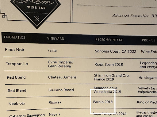 We ordered the 2018 Barolo from the menu; however, we presented with a 2019 bottle instead and offered no expecting or notification of the difference. Truly, we did not notice until the glases were pored. We jokingly ask Jules about it, and he advised that we speak with the Sommelier, which we politely requested. Regrettably, he had retired for the evening after the tasting. It was after 8p. We enjoyed the wine. It is still a Barolo