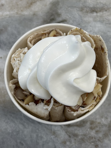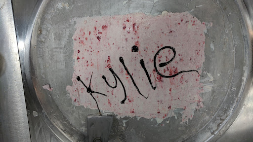 Read moreVery impressed with this place overall. There was a long line at 8:30 p.m. on a Thursday night with it being 38 degrees outside, but the line moved relatively quickly. While we waited, I believe it was the owner's son, came around to give my daughter a toasted marshmallow to snack on. All of the employees were friendly and personable, and the ice cream was delicious. We all chose the ice cream base, but you can also choose yogurt, or vegan base. My husband got the Off Duty, which is coffee ice cream with doughnut pieces, my son got mint Oreo, my daughter got strawberry, and I got the Namaste, which is strawberries, and cheesecake pieces. They call your name when it's your turn in line, and spread the ingredients out on the cooling plate. They mix, press, and roll the ice cream in front of you, then ask if you'd like to add caramel or chocolate syrup. My daughter's pic of her ice cream with chocolate syrup is below. They did my son's name as well. I saw another employee draw a heart for a customer. After that you go down the line for toppings. I saw several people with toasted marshmallows, doughnut pieces, and whipped cream. They have several options. The employee who was working the toppings station came out from behind the counter to give my daughter a small basket of animal crackers. Again, above and beyond service. I hope the enthusiasm from the patrons and employees stays for this place. We need more businesses like this...