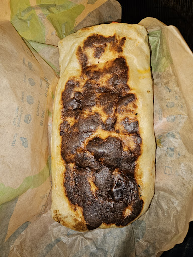 The chicken quesadilla that is so burnt you can see the burnt through the wrapping.