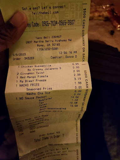 Read moreThis Taco Bell's Mountain Dew® Baja Blast™ Freeze is always down which makes no sense. It seems like everytime we go there it's out and we have to wait in a long line just to exist. Today we went by there after i got off of work & we was told the machine was down and on defrost. So i got a pepsi instead. I quess they heard what i said and gave me the drink for free but was being rush when my spouse asked why was their machine always. Like rushing us and giving us a free drink was going to help the matter. No it didn't because we came there simply for a large Mountain Dew Baja Blast inwhich we do all the time. And believe me I came home and did just what I said I was going to do. Which was give this store a bad review because it truly lacks in delivering good quality customer service. We shouldn't have to drive all the way to Turner McCall or Shorter Avenue just for an icy and to receive good customer service when we live...