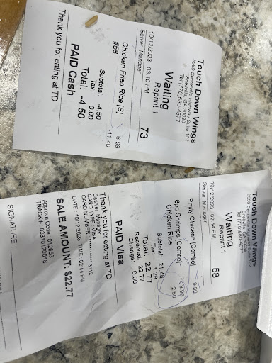 Touchdown Wings is overall a solid wing spot with a unique menu loaded with variety. The food is quality and worth the price. Unfortunately, the service is okay, it is not great, but it is also not the worst out there. The place seems to never not be busy, so there is always typically a wait being the spot’s biggest downfall. Touchdown Wings has its highs in its foods and prices, but the service and typical wait time sets it back from its opponents. Touchdown Wings has quality and flavorful wings. The menu at Touchdown Wings is just not limited to wings though. Their entrees include hamburgers, philly cheese steaks, fish, shrimp, fried rice, salad and several side options. I personally cannot speak for the entrees as I have never tried any besides the wings. The wings take the cake with ease. The wings have a perfect amount of meat and are typically on the wetter side when it comes to the sauce. With that being said, wings have thirty different sauces to choose from. I have had six different sauces, and all were fantastic. The fries being the most popular side choice are solid though can be slightly undercooked for many people’s liking. Overall, the wings are cooked to perfection and covered in the perfect amount of tasty sauce paired and make every penny worth spent. When it comes time to pay for the meal, it will not be a too bad on the bank account. I personally have never had to pay over twenty dollars for two meals. The ten-piece wing combo is ten dollars and some change which is a solid pricing when compared to the amount of food given. Plus, the combo includes a drink which has unlimited refills when dinning in. Unless you are ordering for a family of four or five, then do not expect a high bill. Service is Touchdown Wings’ biggest setback. The cashiers are not terrible, but there is definitely room for improvement. The wait is never shorter than twenty minutes. There is limited seating as the restaurant as a whole is smaller, but with COVID-19 mandates it is even more limited. I suggest for the best experience possible is to call ahead and place the order. Cannot blame the place for being busy and having many customers at a time. You will be taken care of eventually just do not expect Chick Fil A style service. Also, I will say that I have never received any kind of wrong order. Touchdown Wings’ service has its downs, yet it does not ruin the entire experience overall. Dining in at Touchdown Wings is not anything crazy, but you definitely know what kind of environment they are going for. Based on the name alone, the restaurant shoots for a sporty mainly football theme. There are a couple of flatscreens throughout the dinning are playing ESPN or SportsCenter to keep you entertained while eating there. It is a wing spot after all. It is a smaller restaurant, so seating is limited. I personally have never dinned in and always opt to get carry out, but it is simply a personal preference. The atmosphere is harmless and what you expect from this kind of restaurant. . To sum it all up, Touchdown Wings is not the most perfect restaurant out there, but the quality of the food is where it strives. The service can be lacking sometimes, but it really is not that big of deal as not much service is really required. On top of the service, the wait can be a bit long and possibly too long sometimes. The feel and atmosphere of the place is a sporty theme hence the name Touchdown Wings. The thirty different sauces and wings is really what makes this place. The wings are perfect and priced reasonably making up for all that Touchdown Wings lacks. Touchdown Wings is not the fanciest of places, but it does...
