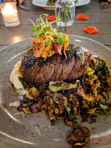 The Lobster bisque came to our table 6 minutes before the spoon to eat it with did, and was really more of a coconut milk bisque with 2 bits of fried lobster. The seasoning on the filet was good. I like a bloody steak, but my wife is a more medium-medium rare type person. Her filet was so rare in the middle, that I would have sent it back too. The lobster on top was the worst thing of the night. It tasted like what I imagine the crab legs you get from the All you can eat asian buffet taste like. The sides were great, but when they brought her steak back out, as expected they gave her new sides. The new brussels sprouts were different than the original plate. These had some pieces of bacon scattered throughout. Which is good, but the first plate of brussels didn't so it was a little alarming until we looked back at the menu and saw that was intentional. Also, once they brought the steak out it was still under cooked, but we weren't there trying to be jerks and she just ate around the parts that were a bit on the blue side.