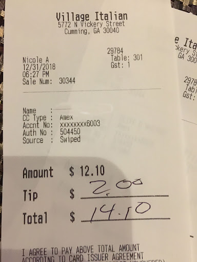 I love Vickery (especially Tanners and Cherry Street), I can’t tell you if the food at Village Italian is any good or not, the place looks good, it is not busy but don’t try and split a pizza, we tried but doubt we will be back. As a small business owner I understand this place has changed hands a lot. I can only hope the owner gets it together as the place...