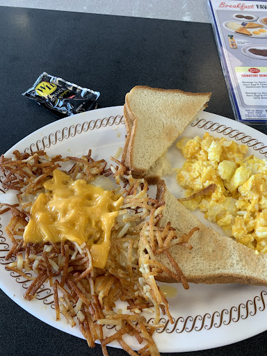 First of all, it was FREEZING in the place. There were gentlemen in sleeves and they were saying how cold it was as well. I guess I am just used to the waffle house by our house and I am not sure if they are just so much better and this place was average or that the place by our house is typical and this was just really bad. I ordered large hash browns smothered covered chunked and diced. I kid you not because I counted them... there were 5 pieces of ham and 4 pieces of tomato in my large hash browns. I think there might have been 4 pieces of onion, but only 1 really big enough to actually notice. I promise I am not making this up! Also for the large hash browns at the waffle house near our house they put 2 pieces of cheese on the large (double) order and there was only 1 piece of cheese on these hash browns. I felt sorry for the waitresses a because they had food and weren't able to eat it so they were eating their food for their break while waiting on customers. I don't think that's a good practice at all. Nothing was really really bad but the experience was less than average. I got a coffee to go and once again at the waffle house by our place they give you the bigger cup size and they gave me the smallest cup size and it was only like half full to boot. The waitresses were friendly but over whelmed. I had to ask for coffee two times, but again, they were friendly. I think I'll stick to going to the waffle house in our...