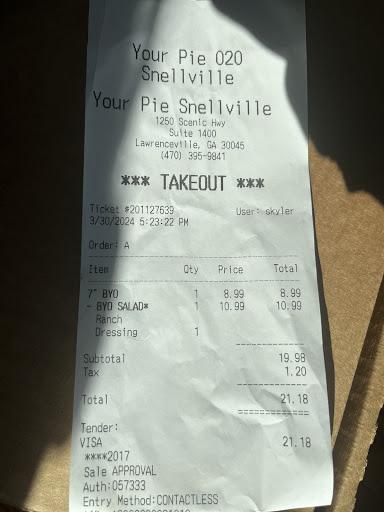 Ā Ā Ā Read moreVery disappointed with this location customer service ,,, I ordered a 7ā kids pie and an entree Caesar salad (totaling $21 š¤¦š½āāļø). Well, the salad bowl barely had any lettuce && the kids pie went from being a kids meal to a āspecial 7in pieā because there was an extra topping. All of a sudden the price went from a kids pie to a BYO 7ā (unbeknownst to me). At the register the cashier tells me āoh well due to the extra toppings itās no longer a kid mealā. I was highly frustrated because it didnāt make sense, since I started the order off by saying I was ordering a kid pie, no where along the way of ordering did any worker info me that anything in excess will change the meal and price. I eventually spoke to the manager on-site and they tried to reiterate that on the menu it lists that the kid pie is only 2 topping (which when I looked back it does say). I said, well if I informed the 1st worker that I wanted to order a kid pie, how by the 2nd worker no one was able to inform me of the change in pricing nor order title. The Manager appeased me by honoring the kid pie not in price but with the meal combo. My issue is in the lack of communication (clarification in ordering) they are providing and strongly encourage them to train their staff in better communication tactics amongst themselves and customers. As this was my 1st visit to Your Pie, I didnāt understand their ordering /menu and wouldāve benefited from staff being more communicative.