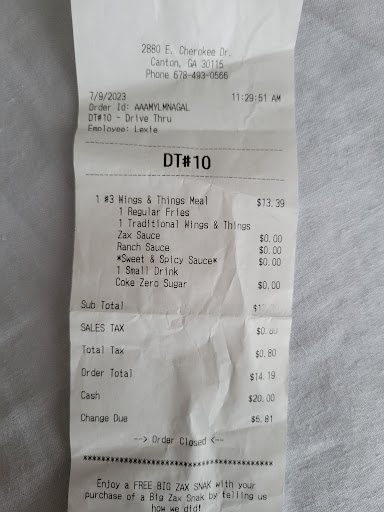 Ā Ā Ā Read moreI appreciate the music selection inside the store, however the dine in experience is not good. It felt like the AC was broken, it smells pretty bad in the seating area. There was dirt and stuff caked on the carpet mats. Tables had previous customer left over crumbs and spilled drinks on tables. The door handle coming in was sticky, there were bugs crawling in the floor in the ladies room and ripped toilet paper all over the bathroom floor. The chicken tenders had an off texture but the fries were standard. I'm thoroughly turned off from this location of Zaxbys probably for a very long time. When there's a chic fil a right across the street they don't seem to be worried about competition based on cleanliness and done in...