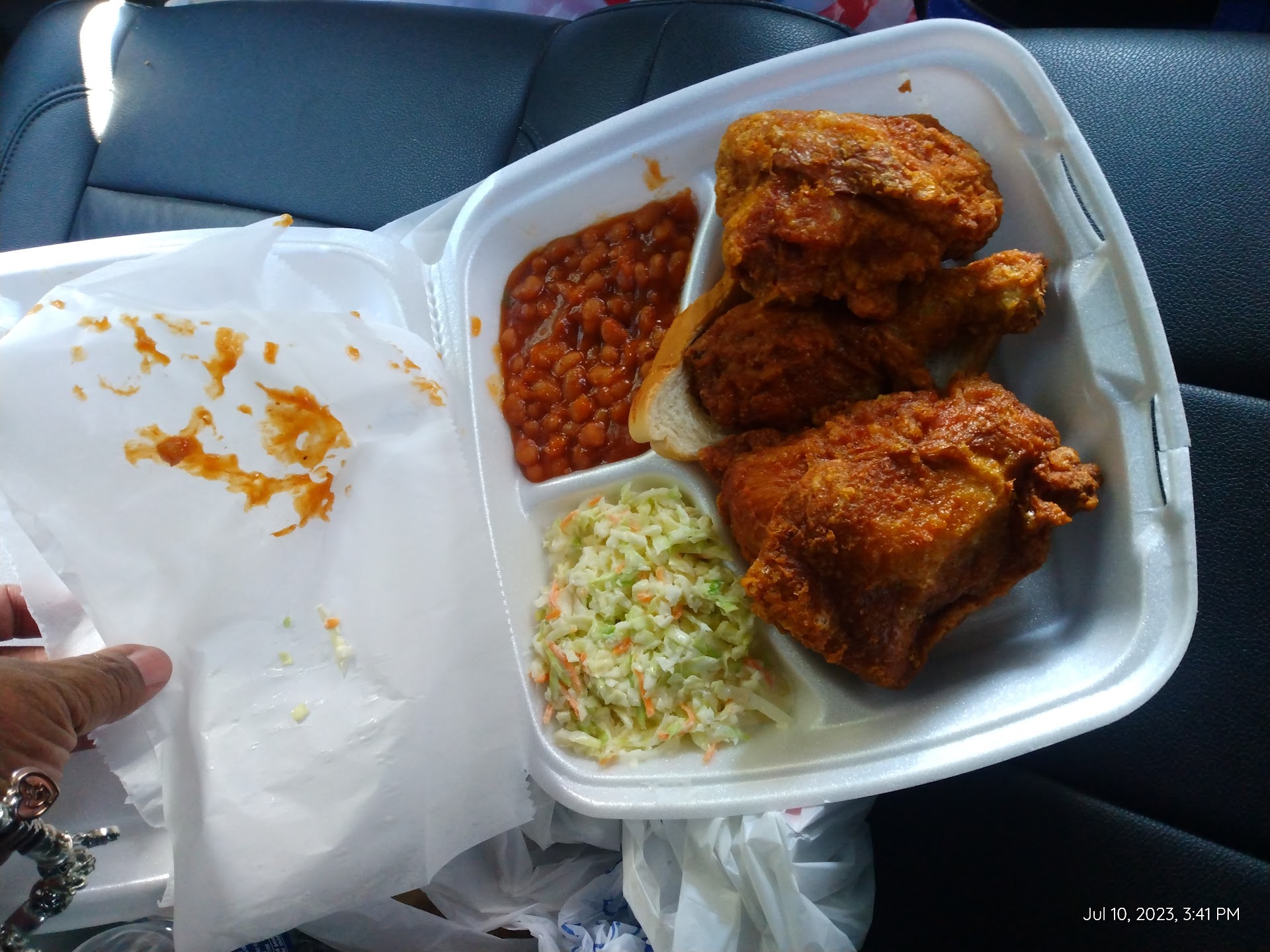 The chicken is fried hard yet it's juicy in the inside. It had some nice spice and heat to the flavor. I ordered a three piece. It came with Cole slaw and Baked Beans. Most times the sides are lacking. Not here. The beans really tasted like I made them myself. Ok so that must mean the coke slaw is got gonna be a hit. Nope it was good too. This is a plus. Because 9 times out of 19 something not going to be right.