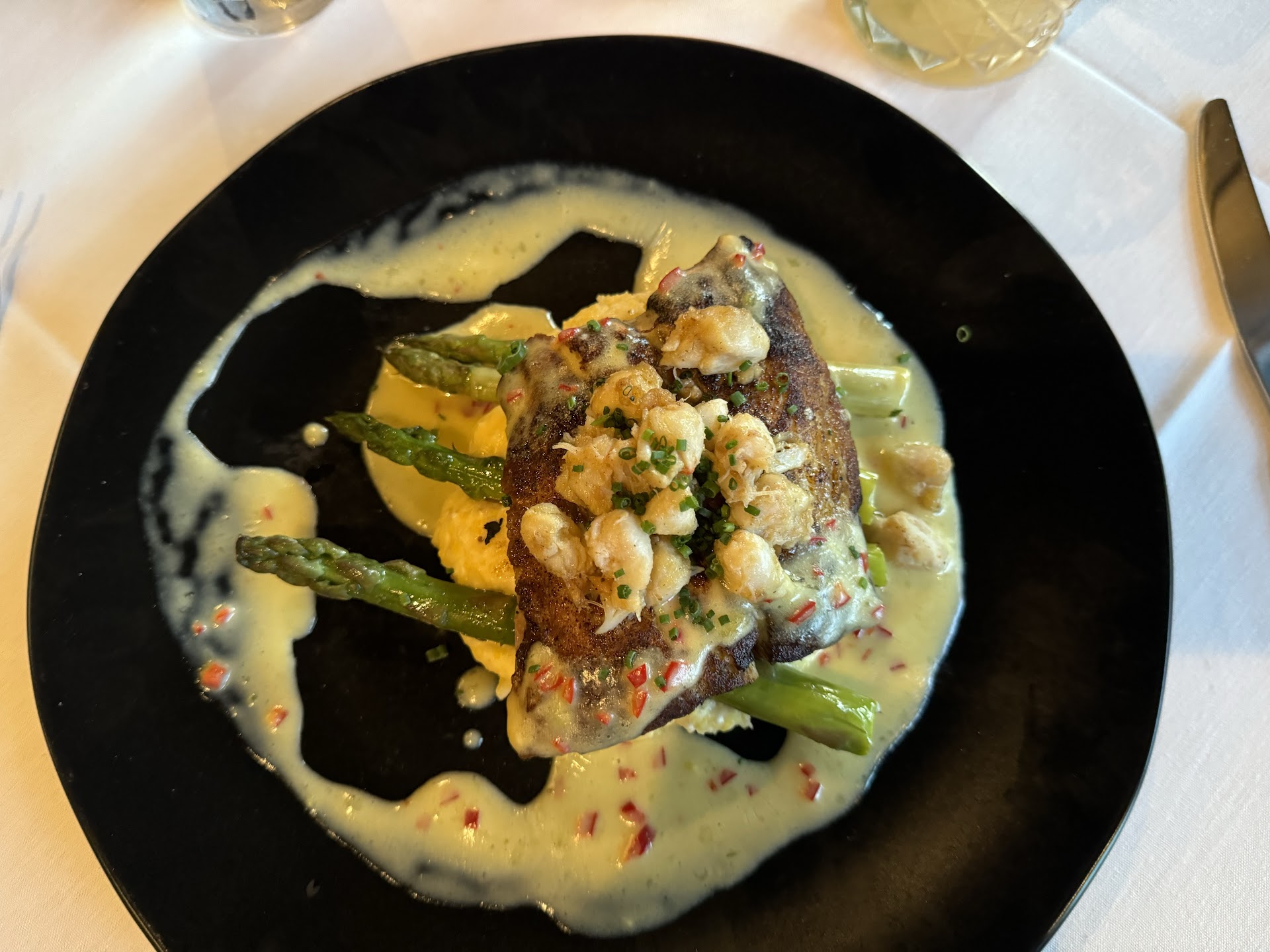 It's interesting that every single wait staff welcomed us. We meandered through the building to "hello" and "enjoy your meal". The top of the menu said Happy Anniversary. Nice touch. We ordered drinks and salads. At least my wife got her drink. Enough said. We both ordered the harvest salad. Very good. The entree was excellent. My wife had the Tomahawk Pork chop. I had the Chilean Sea Bass. We asked the waiter to box the remainder of the Pork Chop and we ordered dessert. The waiter came back and apologized that the pork chop had accidentally fallen off the plate to the floor. They offered to make us a new one, but we declined.