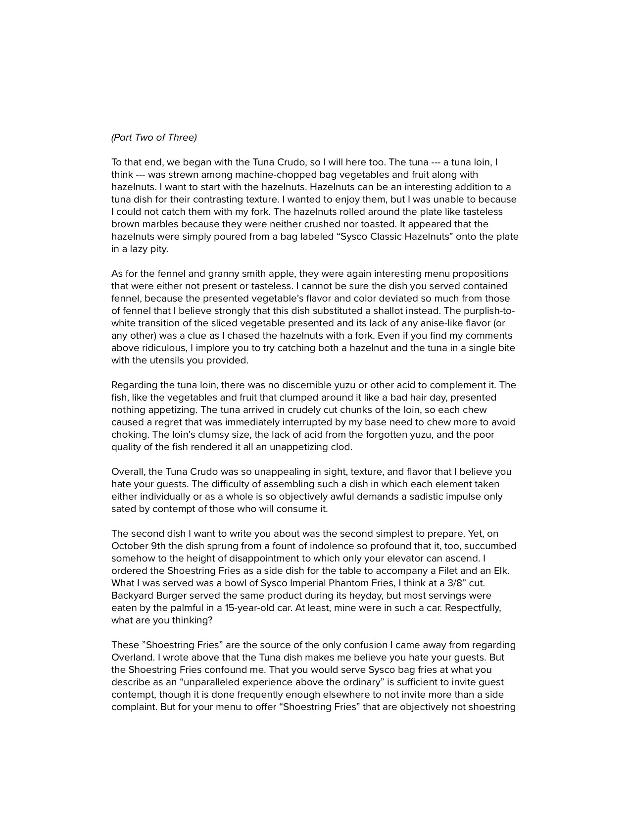 The contempt for food and for your guests at Overland compels me to write this admittedly mean letter. The quality of the food we were served at Overland was so poor that I believe you either hate your guests or think that they are stupid. That is a ridiculous claim, so I want to describe two and a half dishes from the perspective of a human eater who very much wants to support new fine dining restaurants in Memphis...