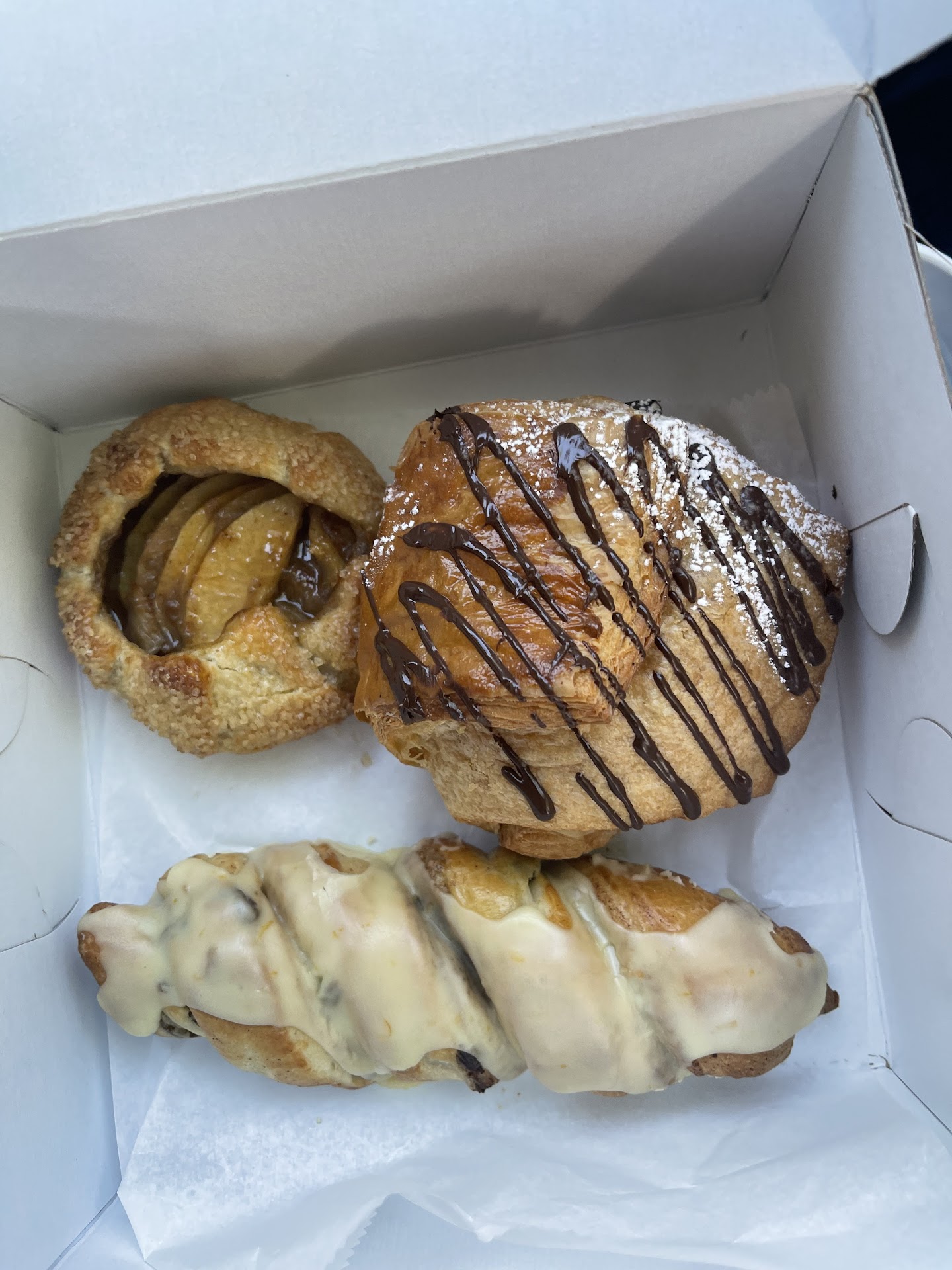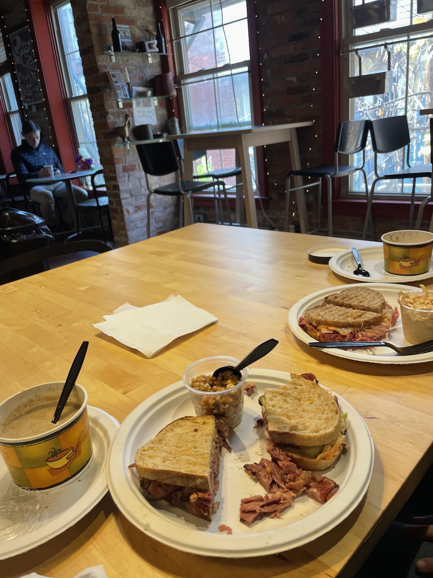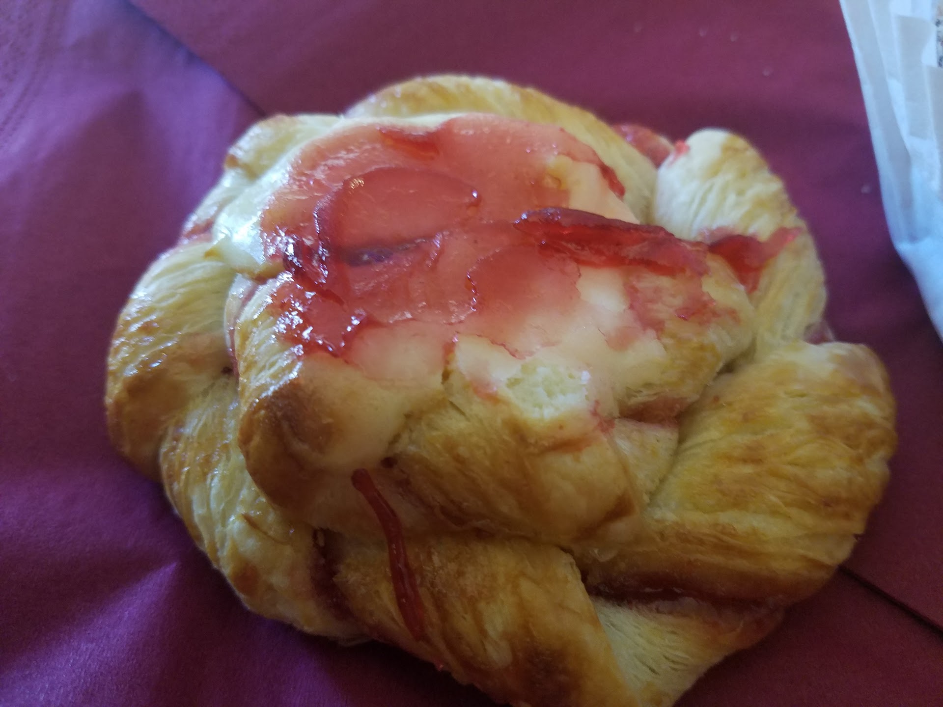 My husband and I stopped in for a quick breakfast before one of the local tours. We got a selection of breakfast pastries, the apple tart was by far the best! The cinnamon raisin twist was a little more bread like texture than I was expecting but still tasted ok. I did not like the chocolate croissant at all because it was so dry and flakey, didn’t have much of a taste to the pastry itself and the chocolate was so minimal and tasted almost bitter, the inside only had one line about the diameter of a pencil of chocolate. It was too messy to eat. After the tour we decided to go back and grab a sandwich for lunch. I had the pesto panini. It was quite greasy on the bottom but tasted OK, I got a side of the couscous and it was quite dry and lacking in flavor. My husband got the ham and cheese on a croissant with potato salad and he enjoyed both of those menu items. It took a little longer to get our lunch items because they were made fresh after ordering. I also thought the prices were a little high. $4.25 each for the morning pastries and $9.25 each for the lunch sandwich. The building itself was very hard to find. It’s tucked away in a corner inside...