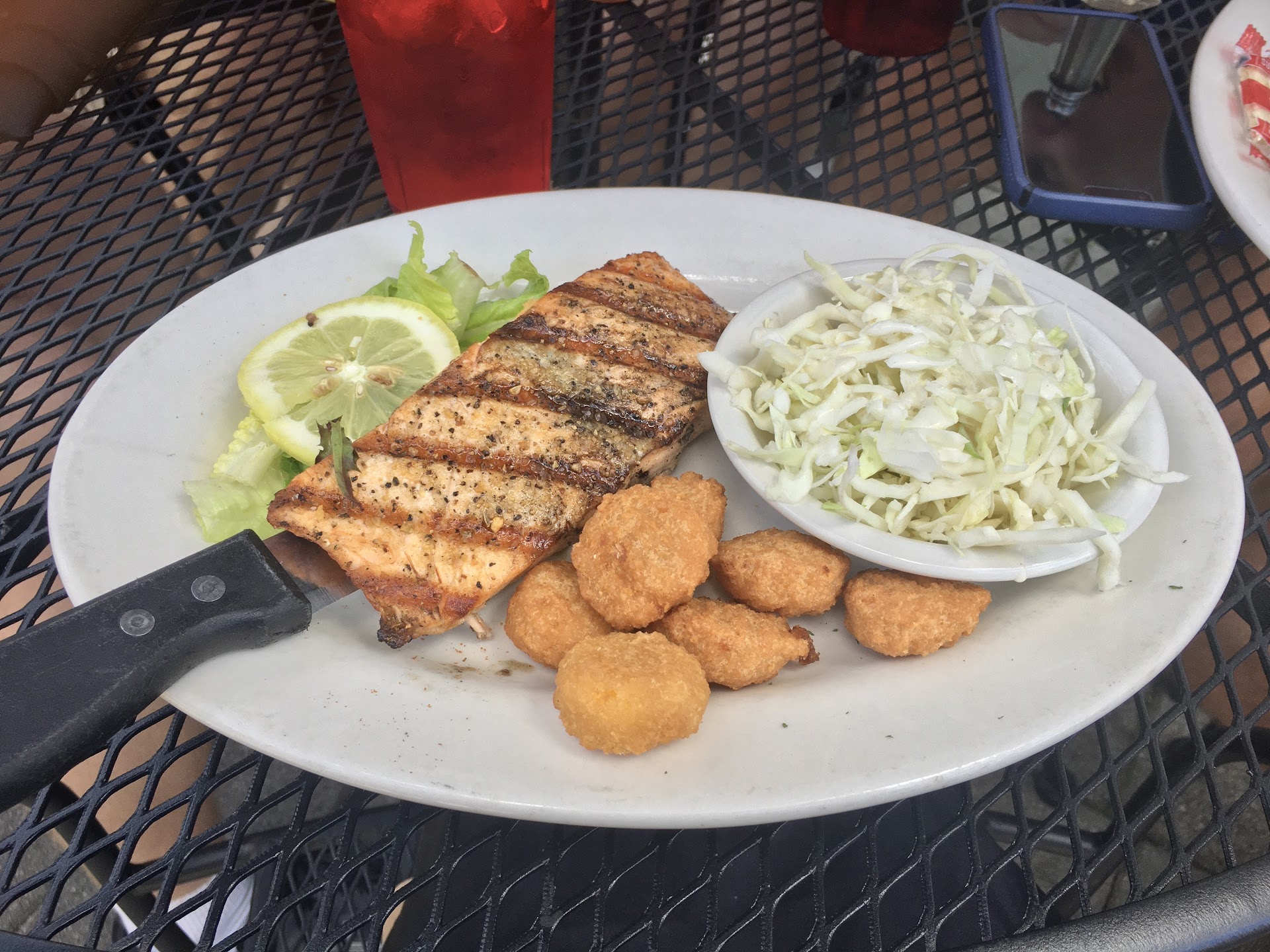We both ordered the soup and half-sandwich lunch special. Cream of crab and chicken salad. The cream of crab is pretty bad. There was a complete lacking of cream flavor. It was thick, translucent and "jiggly", so maybe cornstarch instead of a roux? There was a serious lack of flavor and seasoning. There is just zero imagination in this soup. I don't know, maybe try some sherry, onion, parsley or green onion? Tons of ways to make a great cream of crab! In the end it felt like old bay sprinkled over cornstarch-flavored Jello, with a little crab.
