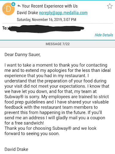 I got an obvious impersonal form letter back from the franchise manager with no detail about my specific situation. I guess this happens a lot, since he clearly has no time. The letter offered a coupon for a free sandwich. Ok, I guess that's the bare minimum one can do, though "also a cookie" or some similar trivial token for the inconvenience of my wife not getting lunch would've been nice. When I replied to the email with my mailing address, I got a bounce message. Apparently the manager CC'd an invalid email. Great use of tech there.