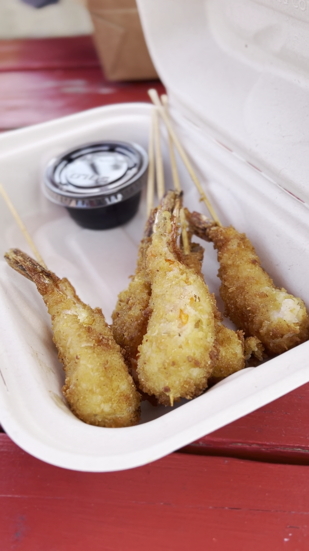 The coconut shrimp shouldn't be served on skewers, it's a cute presentation, but it was incredibly difficult to eat because the shrimp doesn't slide off the wooden stick, it sticks to it.